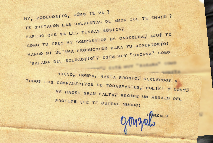 Ahora, gracias a internet, he encontrado el medio perfecto para traer de nuevo a Gonzalo, fresco y digitalizado, y escuchar lo que nos quería contar. Así, cumpliendo con el objetivo de hacer público este material, mucho de él inédito o que luego serían publicados con títulos distintos, que nos muestra al Gonzalo de los años 60 —con su rebeldía, su pasión, su compasión y su fino sentido de humor—, estoy ya en el borde del precipicio para poder finalmente tirar al vacío su presencia y su voz. ¡Saquen, pues, el aguardientico!
