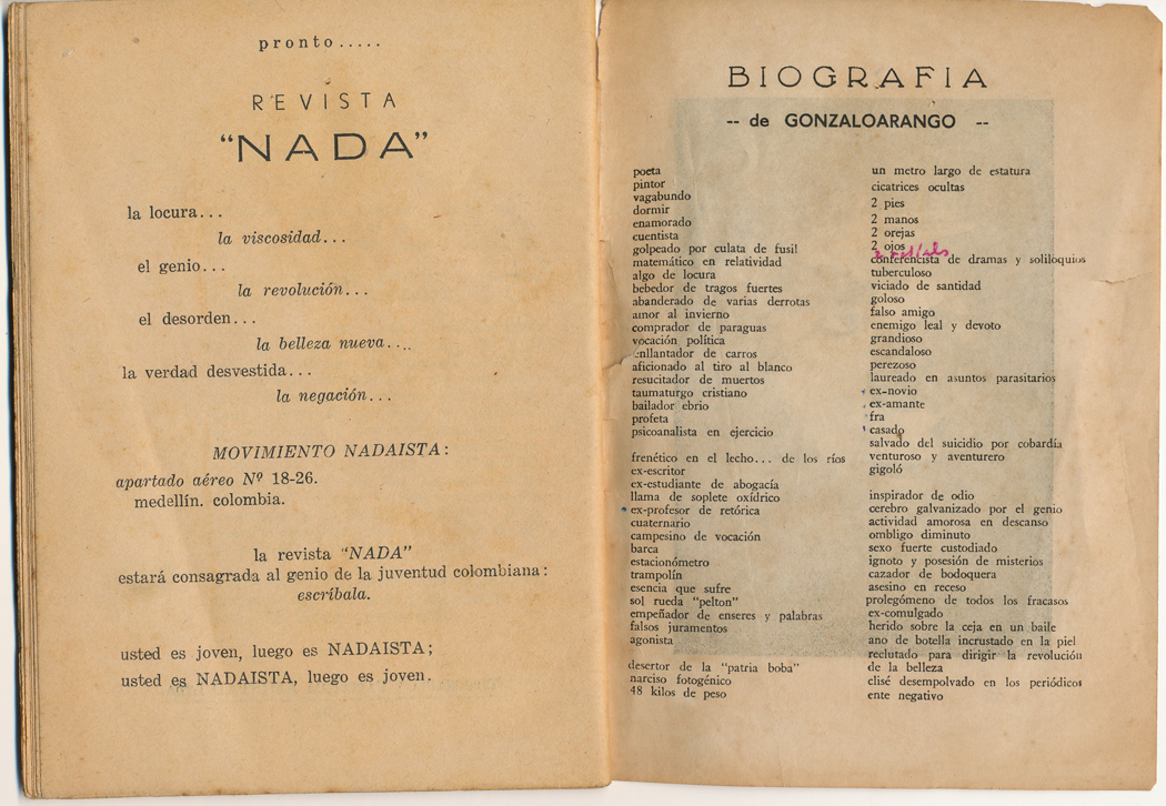 El folleto titulado: "Manifiesto Nadaísta - gonzaloarango”, impreso por Tipografía y Papelería AMISTAD Ltda.